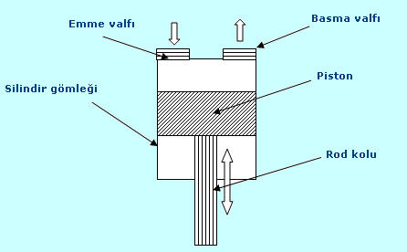 Pistonlu Kompresör, Pistonun alt noktaya olan hareketiyle atmosfer gazının emilmesi sonucunda kuru hava filtresi sayesinde temizlenir ve emme sübaplarından geçerek bir sonraki adıma başlar ve aynı şekilde üst noktaya olan hareketiyle basma sübapları sıkıştırılır. Elektrik motoru kayık-kasnak sistemi, kafa bloğu sayesinde teşvik edilir. Kafa bloğunun, pistonlarla silindirler arasında, krank ana ve yatak rulmanlarının yağlanması amaçlanır. Bunun akabinde özel olarak üretilen pistonlu kompresör yağları biyel kollarındaki yağlama çubukları sayesinde çarpmalı yağlama sistemiyle yağlanıp sonuçlandırılır.
